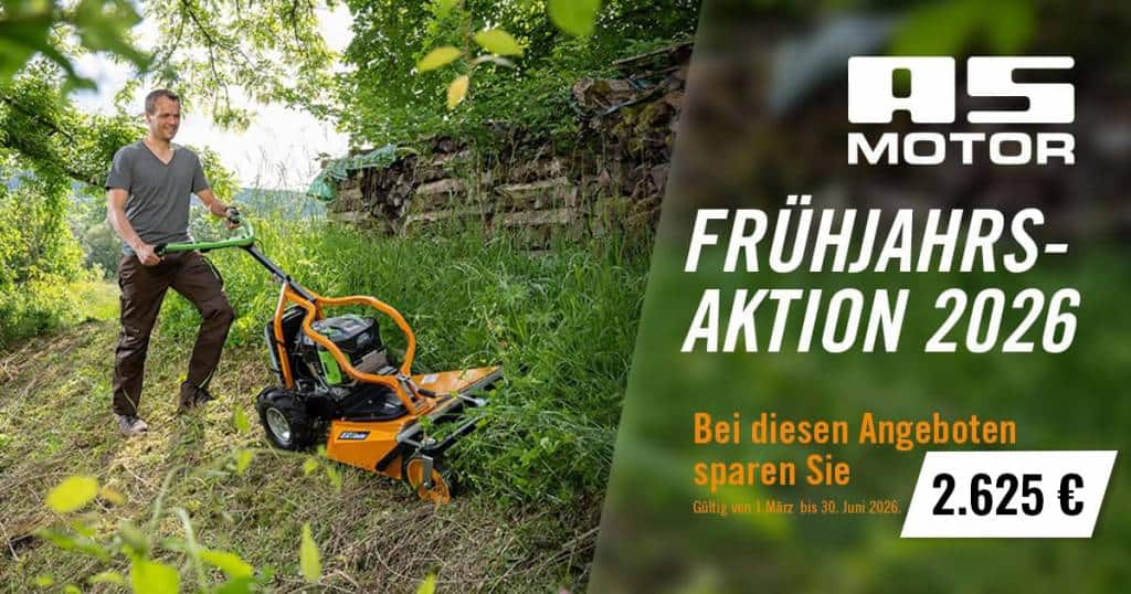 Sichern Sie sich bis zu 2.625,00 € Rabatt auf ausgewählte Profi-Mäher von AS-Motor Modelle – nur für kurze Zeit! Vom 1. März bis 30. Juni 2026 profitieren Sie von attraktiven Aktionspreisen auf leistungsstarke Maschinen für Hochgras, steile Hänge und große Flächen.