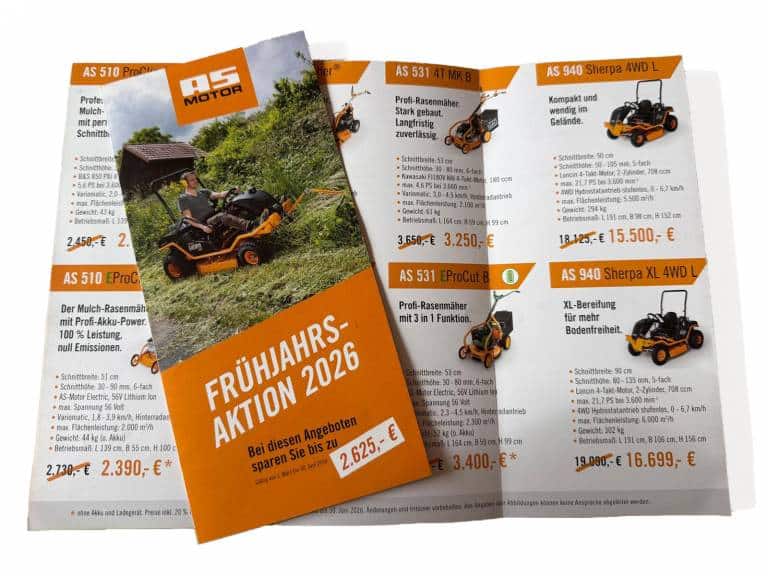 Profitieren Sie von bis zu 2.625,00 € Rabatt auf ausgewählte Profi-Mäher von AS-Motor! Unser Frühjahrsaktions-Flyer enthält alle Details zu den Aktionsmodellen und Vorteilen.