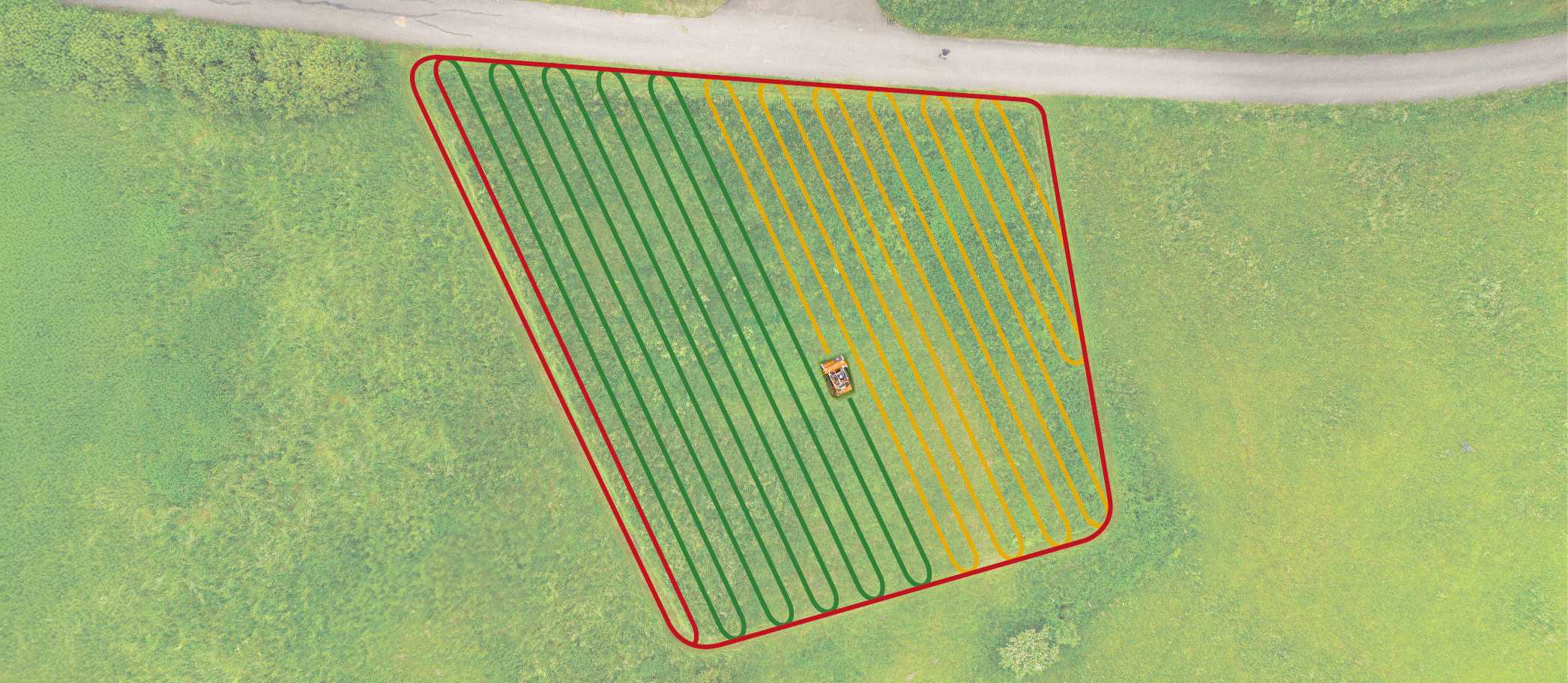 Nach dem Umfahren einer Fläche und der ersten Linie wird die Fläche automatisch gemäht. Das Wendemanöver erfolgt automatisch an der abgefahrenen Begrenzungslinie. Der Anwender überwacht den Mähvorgang.