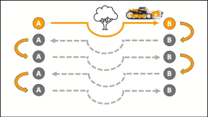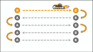 Die Fahrstrecke zwischen Punkt A und B wird gespeichert. Das Fahrmuster wird parallel über die gesamte Fläche wiederholt. Wenden erfolgt manuell. Es ist unerheblich welche Linie als nächste angefahren wird. Das Mähmuster ist variabel in der Ausführung.